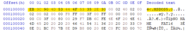 FAT VBR의 0 바이트 오프셋부터 3바이트 크기의 데이터는 FAT의 VBR로 점프하는 JMP 인스트럭션이 존재한다. 이를 헥스 스트링으로 표현하면 "EB 3C 90"이 된다. FAT의 VBR 구조를 다루는 건 본 글의 주제에서 벗어나므로 설명하지 않겠다. 3바이트의 JMP OP코드 후 OEM 이름으로 MSDOS5.0이라는 문자열이 이어진다. 아래 그림은 FAT의 VBR 일부이다.