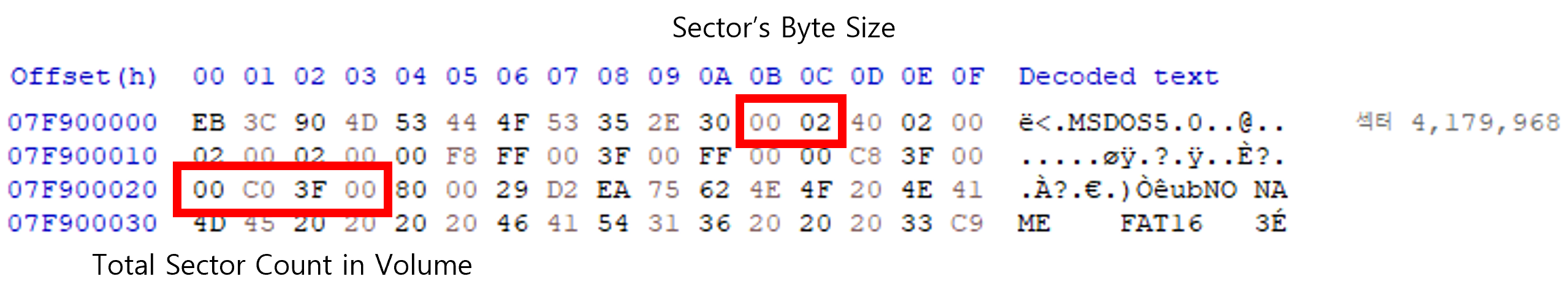 FAT 볼륨의 크기는 FAT VBR을 분석해 알 수 있다. 앞서 말했듯 FAT VBR 분석은 본 글의 주제를 넘어서므로 아래 그림의 위치가 해당 볼륨의 섹터 바이트 크기, 볼륨이 가지는 전체 섹터 개수를 의미한다고만 알아두자. 섹터 크기는 512(0x200) 바이트, 전체 섹터 개수는 4,177,920(0x3FC000)으로, 볼륨의 크기는 둘을 곱한 2,139,095,040 바이트(2040 MB)다. 섹터 개수인 0x3FC000을 파티션 크기로 지정한다.