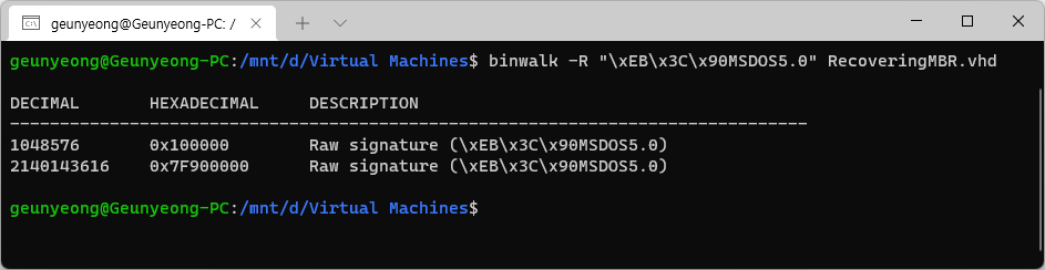 먼저 삭제된 파티션의 정확한 시작 섹터를 알아내야 한다. 파티셔닝만 한 것이 아니라 파일 시스템도 적용했다면 파일 시스템의 VBR이 해당 파티션의 시작 섹터에 존재할 것이다. 본 글에서는 FAT VBR의 부트 코드 일부와 시그니처를 사용해 Binwalk로 찾았다. 이러한 VBR을 찾는 과정은 개인이 편한 방법을 사용하면 된다.