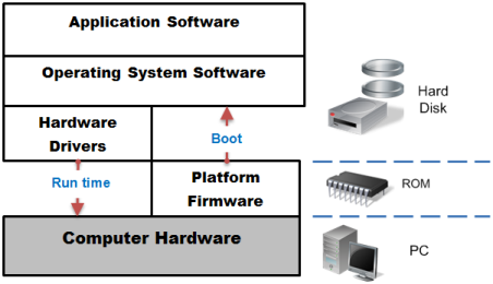 단순 부팅뿐만 아니라 메모리에 접근하고, 하드웨어에 저장된 시간 값을 가져오는 등 운영체제가 담당하는 기능도 UEFI를 통해 운영체제가 이용하는 것이다. 그러므로 UEFI는 아래 그림과 같이 운영체제와 펌웨어 중간에 위치해있는 셈이다.