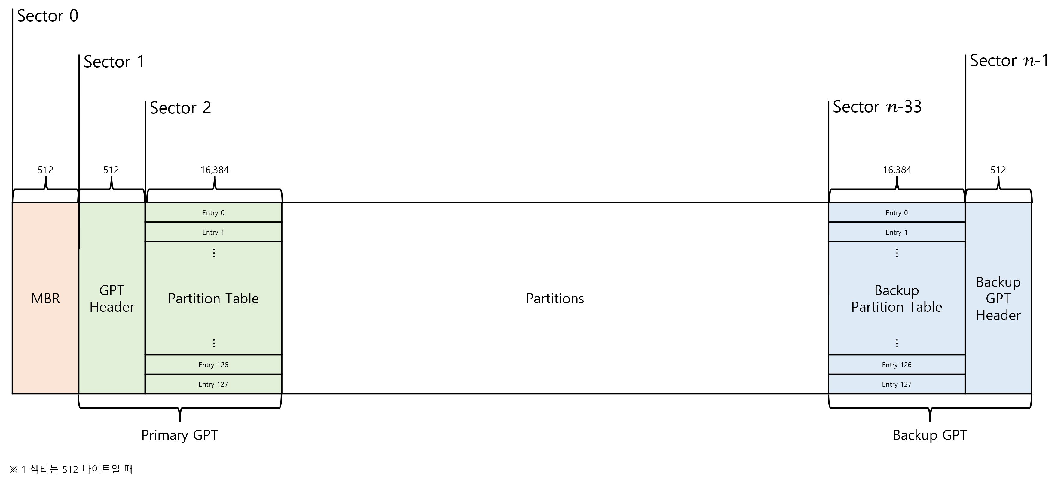 그렇다면 GPT는 무엇인가. GPT는 EFI가 사용하는 파티션 테이블 구조다. MBR에서는 디스크의 첫 섹터 영역 중 446~510 바이트 영역에 16 바이트 크기의 엔트리 4개를 두고 각각의 파티션 정보를 저장했다. 그리고 파티션 정보가 저장된 영역을 우리는 파티션 테이블이라고 했다. 즉 GPT도 파티션의 시작 섹터, 크기 등을 담은 정보가 담겨있다. 확장 파티션이라는 구조를 사용해 5개 이상의 파티션을 나타내야 했던 MBR과 다르게 GPT는 처음부터 많은 수의 파티션을 나타낼 수 있도록 되어있다.