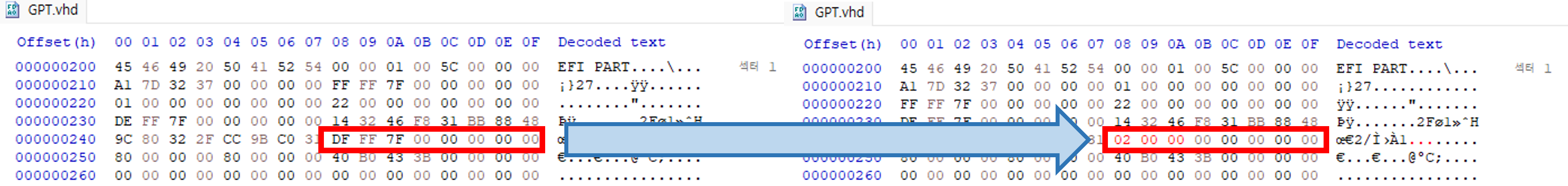 백업 GPT 헤더는 PartitionEntryLBA 필드에 백업 파티션 테이블의 시작 LBA를 갖고있다. 그러므로 주 파티션 테이블의 시작 LBA인 2로 수정해야 한다.