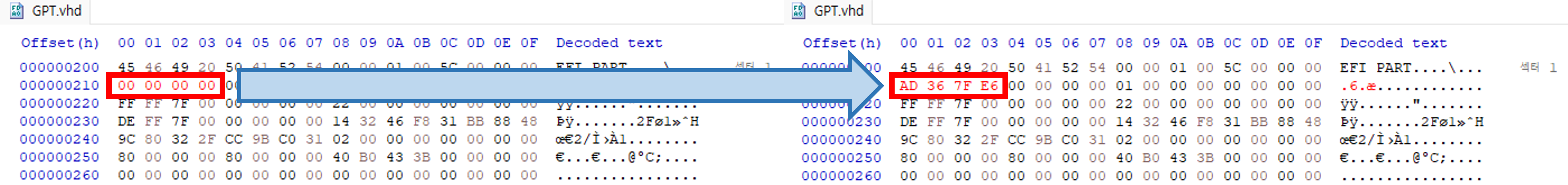본 글의 주제인 GPT를 복구하는 법을 알아보자. GPT를 복구하는 방법은 Backup GPT의 내용을 Primary GPT 영역에 덮어 쓰는 것이다. 하지만 앞서 백업 GPT 헤더에서 보았듯 주 GPT 헤더와 내용이 상이한 필드가 존재하기 때문에 이를 적절히 맞춰주는 작업을 해야 한다.