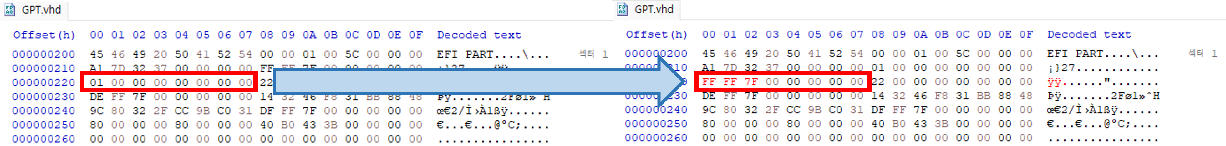 | MyLBA | 24(0x18) | 8 | Primary는 1인 반면 Backup은 0x7FFFFF다. Primary는 1번 LBA에, Backup은 마지막 섹터에 위치하다보니 자기 자신의 LBA를 가리키는 값에서 차이가 생긴다. 위 그림은 4 GB 크기의 VHD에서 백업 GPT 헤더를 추출한 것이기 때문에 마지막 섹터인 0x7FFFFF가 MyLBA 값으로 저장됐다. |