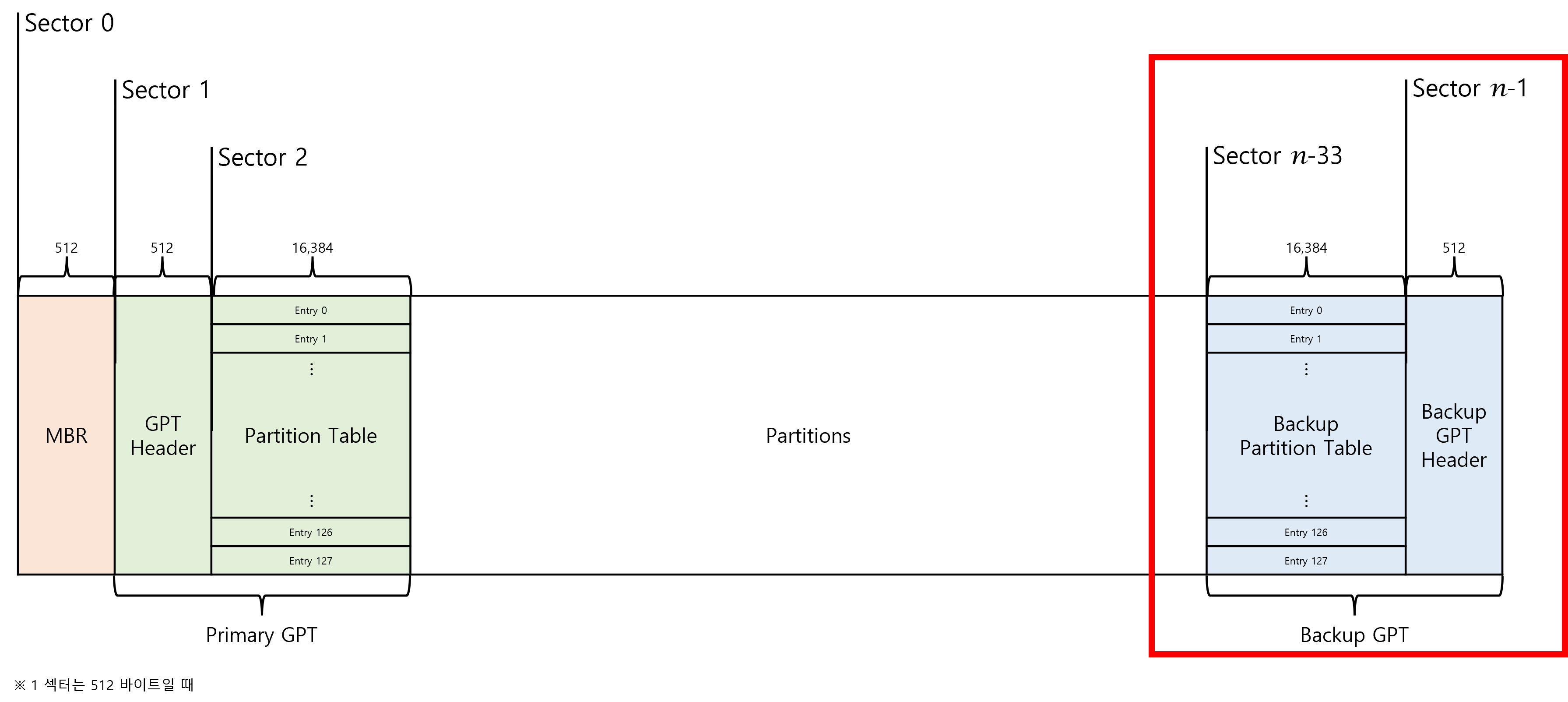 Backup GPT는 Backup GPT Header와 Backup GPT Partition Entry Array로 구성된다.