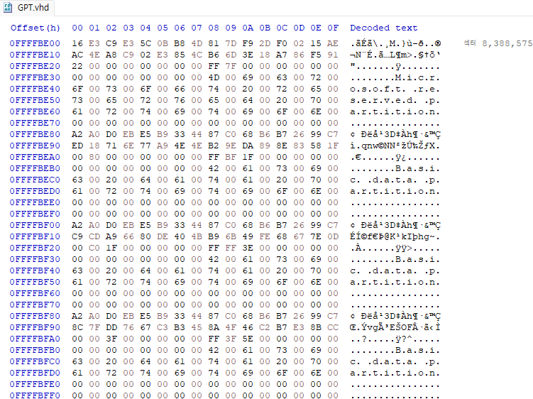 4 GB 크기의 VHD를 예로 들면, VHD는 총 8,388,608(0x800000) 개의 섹터가 존재한다. 마지막 섹터(n-1 섹터)인 8,388,607(0x7FFFFF)에 백업 GPT 헤더가 있는 건 앞서 봤다. 파티션 테이블이 32개 섹터를 사용하므로 백업 GPT 헤더보다 32개 앞 섹터인 8,388,575(0x7FFFDF = 백업 GPT 헤더 LBA - 32 = n - 33 섹터)부터 백업 파티션 테이블이 시작될 것이다. 이는 백업 GPT 헤더에서 PartitionEntryLBA 값과 동일하다.