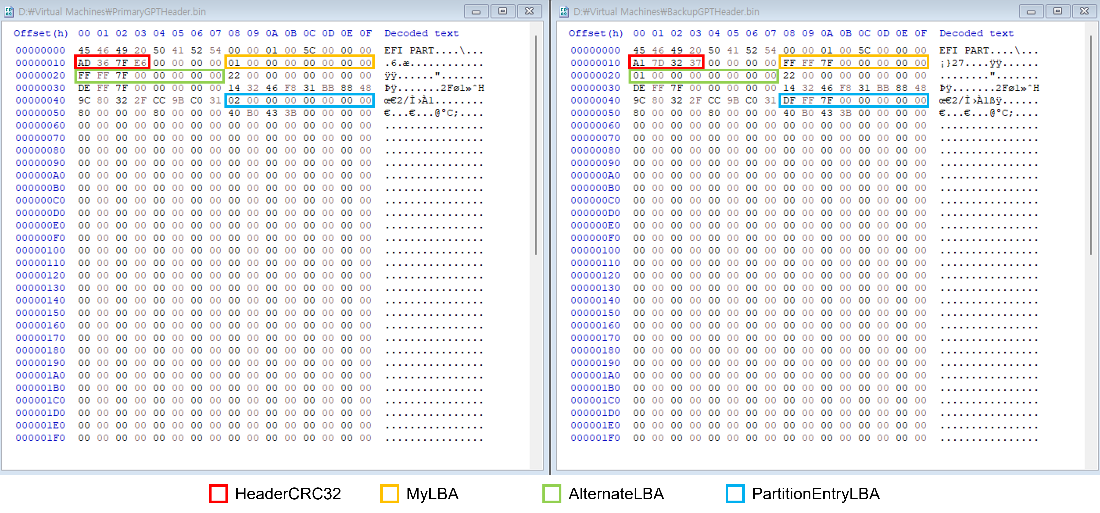 | HeaderCRC32 | 16(0x10) | 4 | Primary와 Backup의 CRC32 값이 다르다. MyLBA, AlternateLBA, PartitionEntryLBA 값이 다르기 때문이다. |