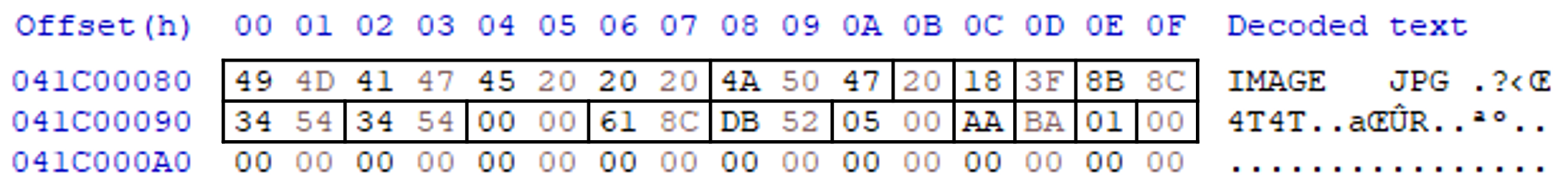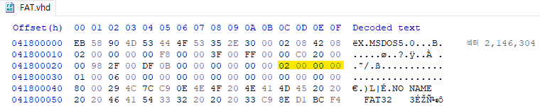 | Starting Cluster Low | 0x0005 | Image.jpg의 파일 데이터 위치를 나타내는 클러스터 주소 4 바이트 중 하위 2 바이트는 5다. 상위 2바이트 값과 합쳐 image.jpg의 파일 데이터는 클러스터 5부터 시작한다. |