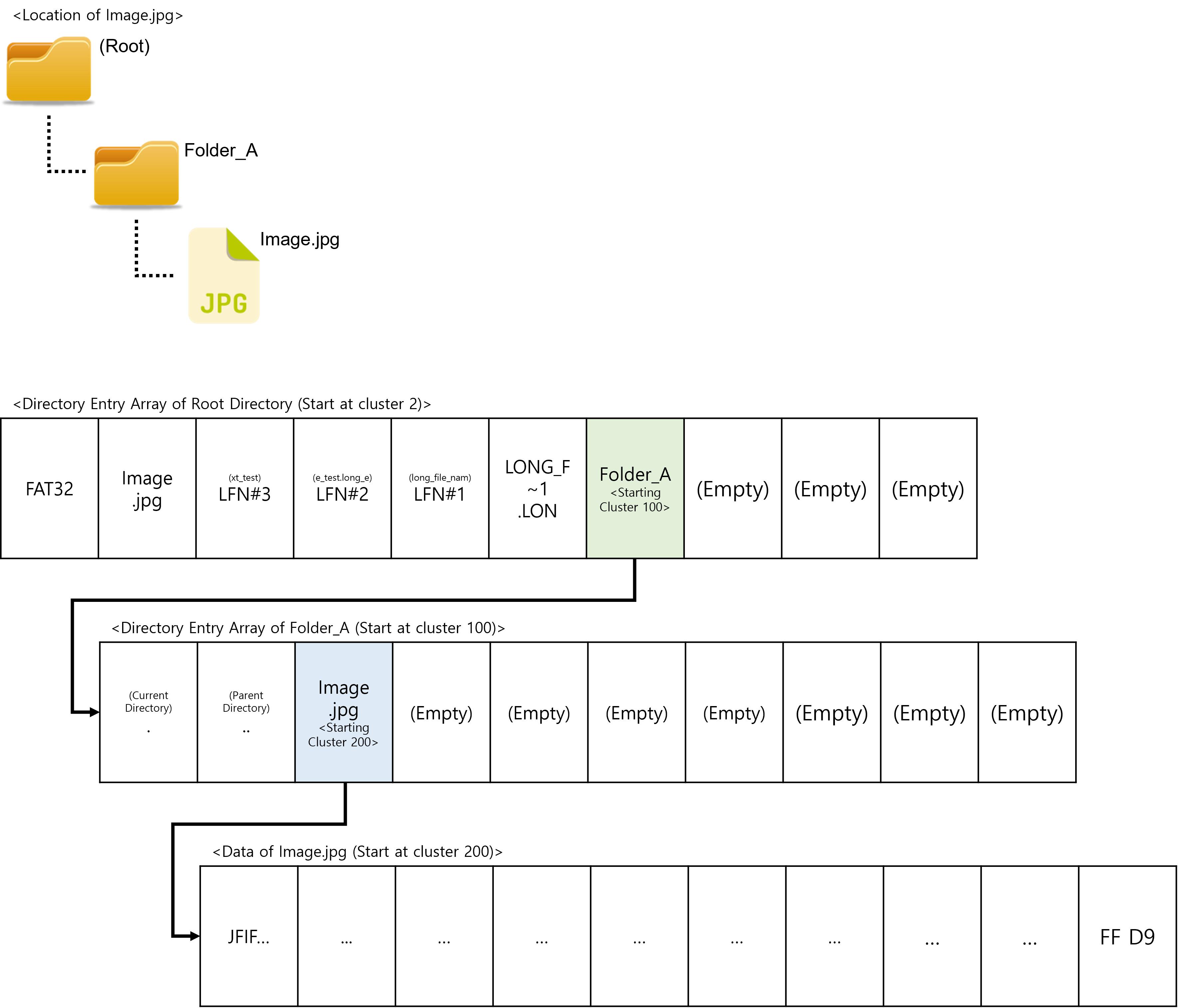 앞서 Root Directory의 Directroy Entry들을 알아봤다. 하지만 알다시피 폴더는 하나만 있지 않다. 하나의 폴더는 여러 개의 하위 폴더를 가질 수 있다. 이런 하위 폴더들은 어떻게 표현될까? 정답은 다중 리스트처럼 디렉토리 엔트리의 배열을 가리키는 방식으로 표현된다. 디렉토리 엔트리 내에 파일의 데이터가 위치한 클러스터를 가리키는 필드(Starting Cluster)가 있다는 걸 봤을 것이다. 폴더를 나타내는 디렉토리 엔트리 Starting Cluster를 따라가보면 또다른 디렉토리 엔트리의 배열이 나타난다.