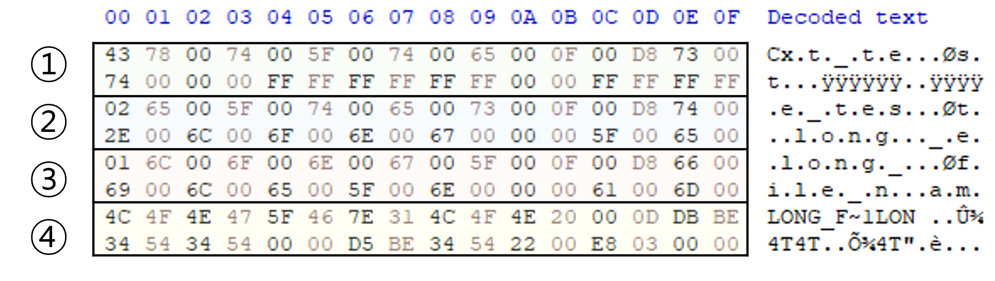 LFN 엔트리를 해석하는 법을 알아보자. 아래 그림은 "long_file_name_test.long_ext_test"라는 텍스트 파일의 디렉토리 엔트리(④)와 LFN 엔트리(①, ②, ③)다. 파일 이름이 19자, 확장자가 13자, Dot('.')까지 합치면 총 33자이므로 LFN을 사용해야만 한다.