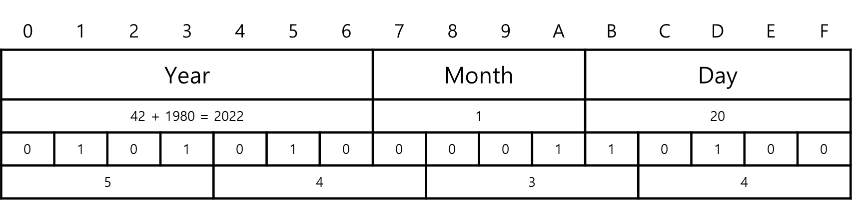 FAT의 디렉토리 엔트리는 날짜도 2 바이트로 표현한다. 상위 7 비트를 년(Year), 중간 4 비트를 월(Month), 하위 5 비트를 일(Day)로 사용하며, 년의 경우 1980년부터 흐른 년도를 의미하기 때문에 1980을 더해야 한다. Date 값이 리틀 엔디언으로 0x3454라면 년, 월, 일은 2022년 1월 20일을 의미하게 된다.