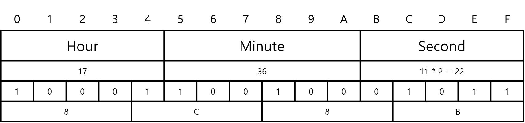 파일의 생성 시간과 수정 시간을 나타내는 Create Time과 Last Written Time은 2 바이트 크기 안에 시, 분, 초를 표현한다. 시(Hour)를 표현하는 데 하위 5 비트, 분(Minute)을 표현하는 데 중간 6 비트, 초(Second)를 표현하는 데 상위 5비트를 쓴다. Time 값이 리틀 엔디언으로 0x8B8C이라면 시, 분, 초는 17시 36분 22초가 된다.