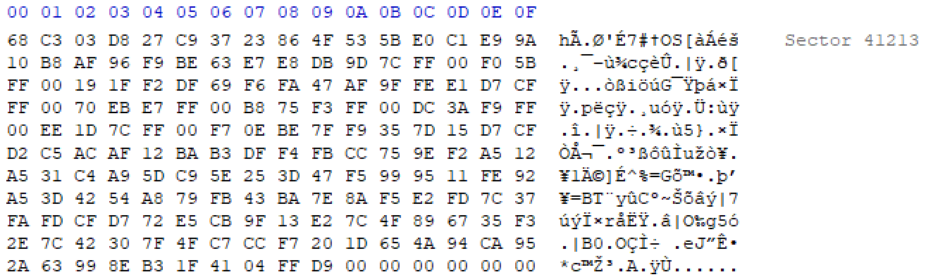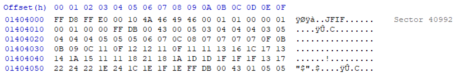 앞서 "File Deletion"에서 보았듯 파일을 삭제해도 Directory Entry에는 삭제 플래그를 제외하곤 아무런 변화가 없다. 즉 Directory Entry가 살아있다면 Directory Entry에 남아있는 Starting Cluster 값을 이용해 원본 파일을 복원할 수 있다. image.jpg의 파일 데이터가 저장된 클러스터 6으로 가보면 아직 JPEG 이미지 데이터가 남아 있는 걸 볼 수 있다.