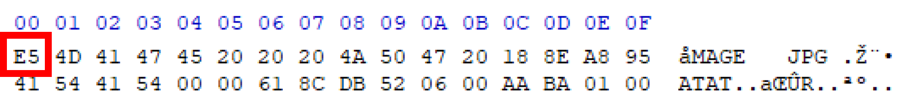 - Directory Entry의 파일 이름 첫 바이트가 삭제 플래그인 0xE5로 변한다.