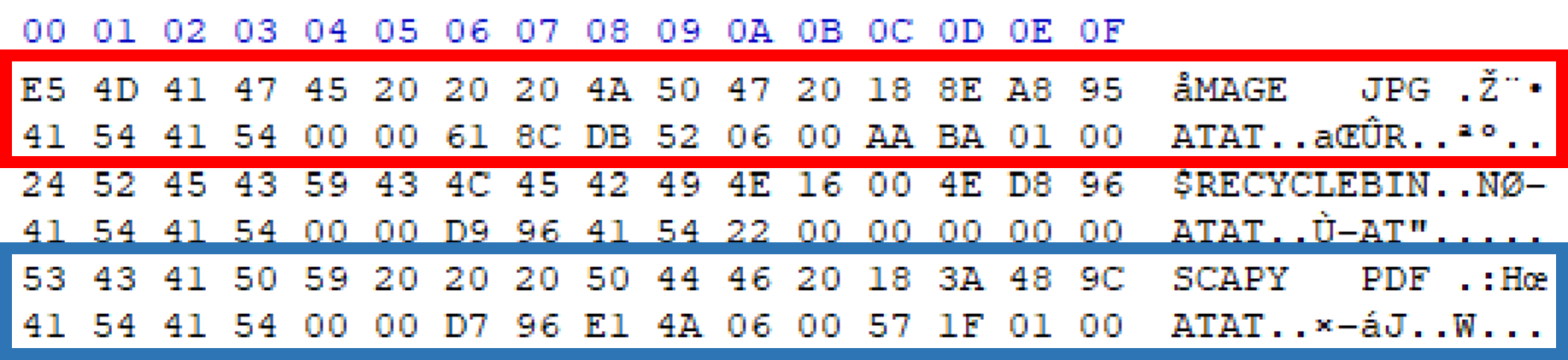 파일 데이터가 단편화되지 않고 연속적으로 존재한다면 Directory Entry에 적힌 파일 크기 만큼을 복사해 저장하면 된다. 그럼 삭제된 image.jpg를 복구할 수 있다. 하지만 단편화되어 연속되지 않은 클러스터에 파일이 저장된다면 이를 100% 복원하기란 쉽지 않다.