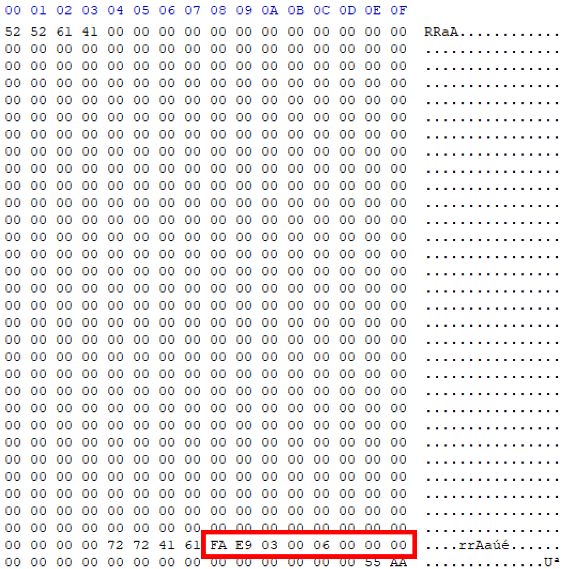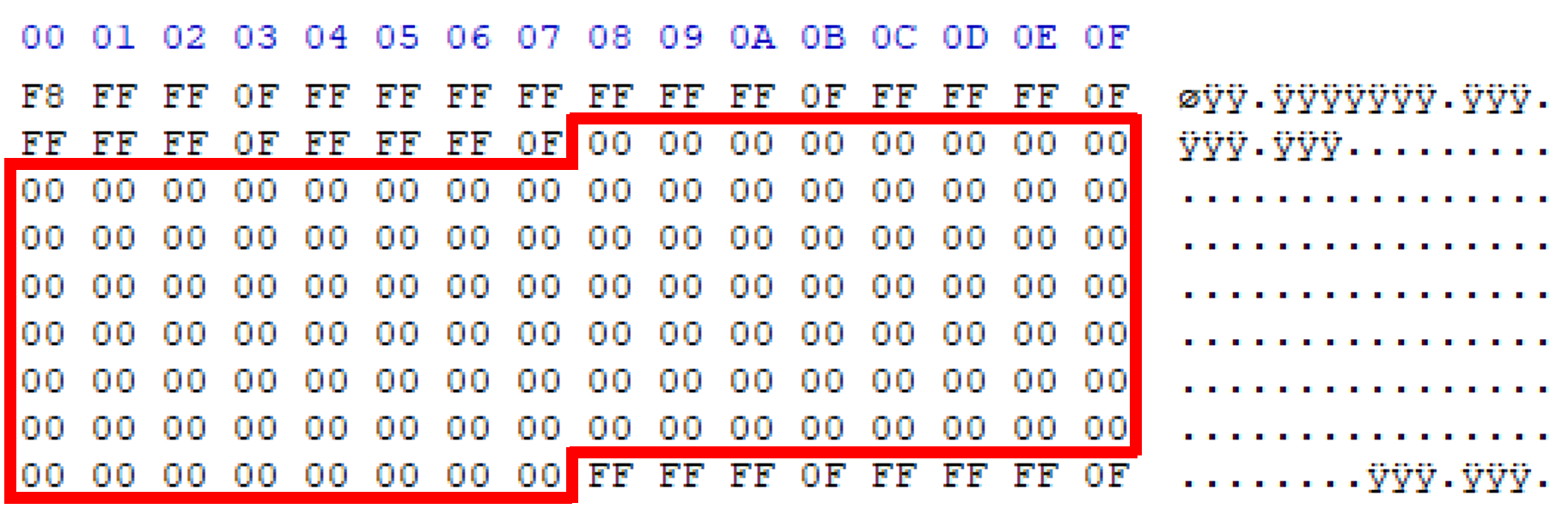 클러스터 할당 정보를 담는 FAT 영역을 보면 image.jpg가 차지하고 있던 클러스터 6부터 33이 모두 0으로 채워졌다. 즉 해당 공간이 모두 언제든지 사용 가능한 Free 상태로 변환되었다는 걸 의미한다.