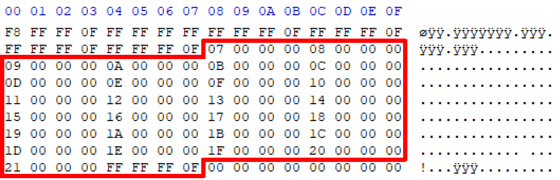 image.jpg가 차지하고 있는 클러스터 목록을 보자. FAT 영역에서 체인을 따라가보면 image.jpg의 Starting Cluster인 6부터 33까지 총 28개 클러스터를 차지하고 있음을 알 수 있다.