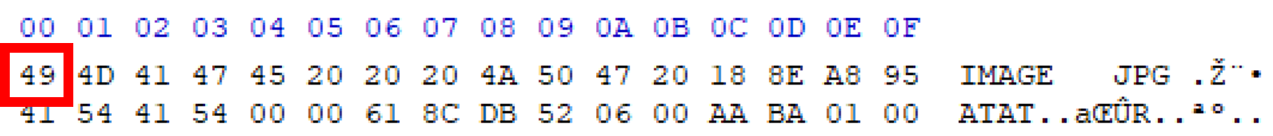 디렉토리 엔트리를 보면 파일 이름의 첫 문자가 0x49('I')다. 즉 아직 삭제된 엔트리로 취급되고 있지 않다. 파일 데이터가 위치한 클러스터는 6이며, 파일 크기는 0x1BAAA(113,322) 바이트다.