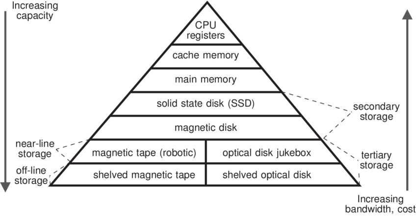 파일은 보조기억장치라고도 불리는 반영구적 저장장치인 하드디스크(HDD)나 SSD 등에 저장된다. 혹은 우리가 많이 사용하는 USB 드라이브도 이에 속한다. 속도는 더 느리더라도 더 큰 용량과 안정성을 요구하는 경우(데이터 백업 등) 자기테이프도 사용한다. 아래 그림에 나타난 저장장치 피라미드는 위로 올라갈수록 속도는 빨라지지만 용량이 작아지고, 반대로 아래로 내려갈수록 용량은 커지지만 속도는 느려지는 저장장치들의 특성을 잘 보여준다.