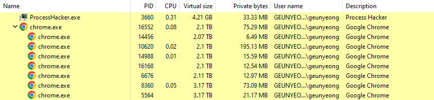 물론 크롬이 무거워진 것도 있지만 2TB에 달하는 메모리를 사용하고 있는 걸 볼 수 있다. 심지어 메모리 사용량이 2TB인 크롬이 6개, 3TB인 크롬이 2개나 있다. 도합 18TB다. 참고로 필자의 컴퓨터에 장착된 메모리는 32GB다.